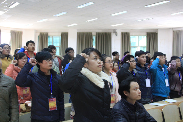 大会在庄严肃穆的国际歌中拉来序幕。首先,由曾竞兴老师带领全体新党员进行入党宣誓,宣誓过程庄严凝重,每位预备党员都以底气十足的宣誓声来表明自己对党坚定的信念,忠诚的决心和庄严的承诺。接着,虢利钢发表讲话,他向全体党员提出了明确要求,要党员做好自身工作,坚定共产主义信念,明确党员的义务与责任,要以实际行动终身践行入党誓言,在为人民服务的行动中实现自我价值,做一名优秀的共产党员。随后,书记易贵元提出,全体党员应协调好学习工作与生活之间的关系,积极发挥模范带头作用,才能做好表率。之后,曾竞兴指出,各位党员在不断学习党章的过程中,要明确身为党员的权利和义务,要做好先锋带头作用,全心全意为人民服务。最后是老党员代表和新党员代表的讲话和表态。其中新党员代表李宗武的表态说出了所有预备党员和正式党员的心声,他表示自己将会恪守在党旗下的诺言,时刻保持共产党员的先进性和先锋模范作用,努力使自己成为一名优秀共产党员。