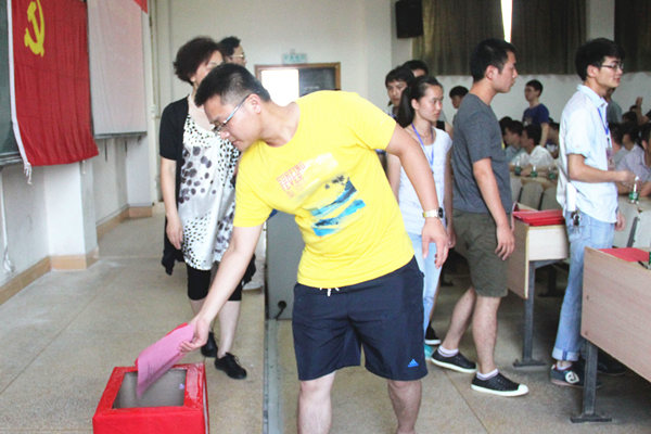 接着,大会集体表决全票通过《大会选举办法》,以及监票人、唱票人、计票人。主持人确认出席会议的党员人数达到选举要求,工作人员宣读校党委批复文件后,大会开始无记名差额投票,选举必赢国际437官网党委补选委员和出席必赢国际437官网第二次党员大会代表。在填写选票之后,各位党员按座位顺序依次上台把选票投进投票箱中。