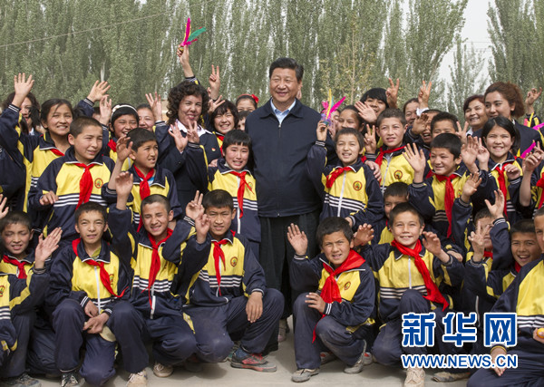 2014年4月27日至30日,中共中央总书记、国家主席、中央军委主席习近平在新疆考察。这是习近平在疏附县托克扎克镇中心小学同学生们合影。新华社记者 谢环驰 摄