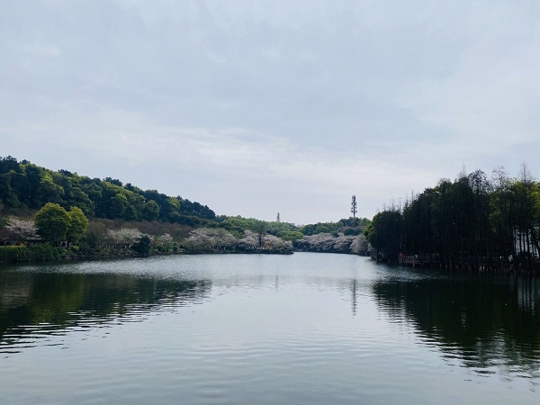 沿着还有些稀落的杜鹃丛,我们到了樱花湖,好一派“早春飞雪”,粉了整座城,惊艳了游人。“满园樱花无花香,悄驻花下迎春来”。这里游人如织,虽然没有风和日丽的好天气,却丝毫不减我们的观花热情。宝石般清透的湖水岸边,山樱烂漫,倒映湖中,游客置身其中,如梦如幻,仿如进入了一副绚烂如霞的的绝美画卷。一阵清风拂来,花瓣飞舞,轻盈飘逸,不似在人间。我们绕湖闲庭信步,聊着,笑着,一路拍着,我们的快乐沿湖飘洒。