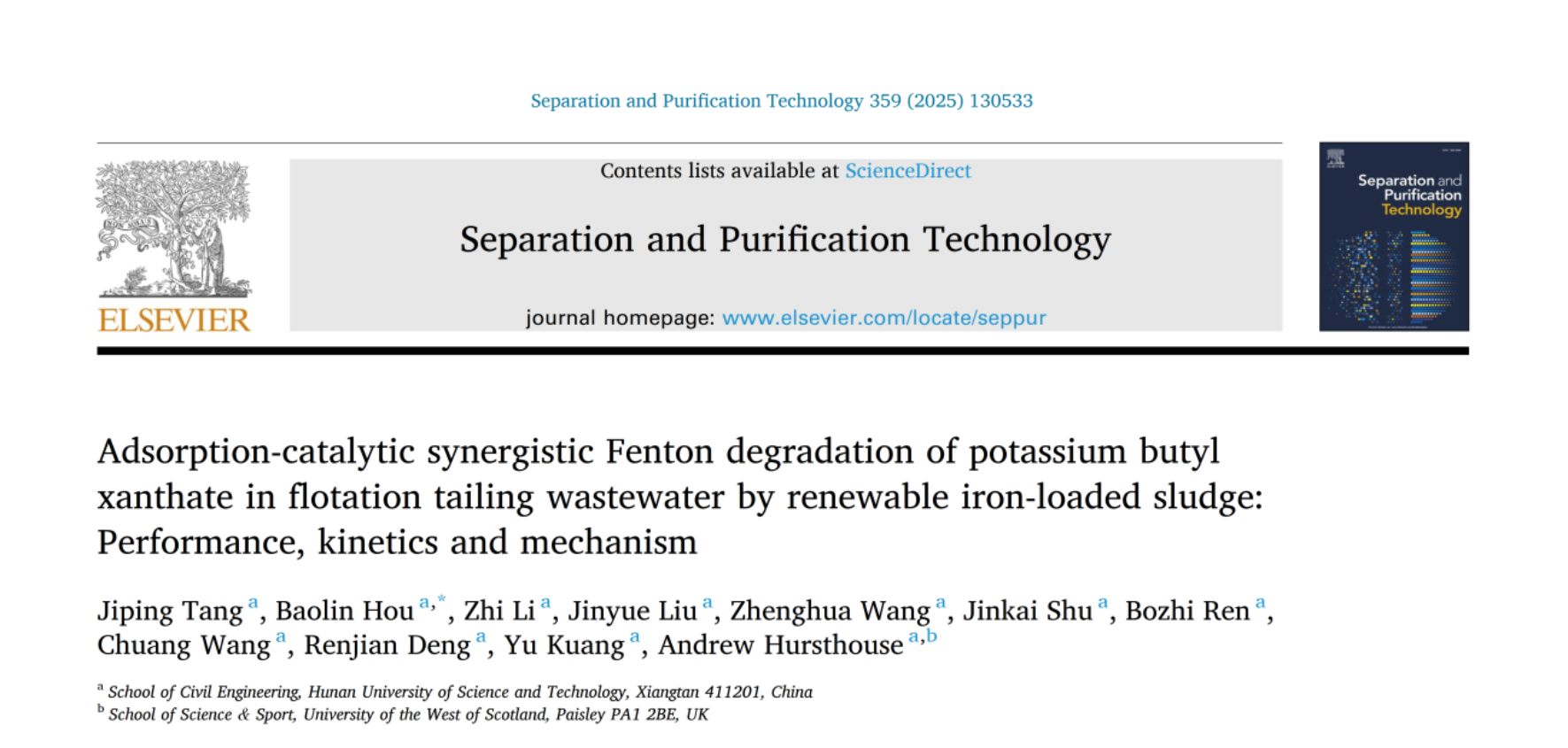 近期,必赢国际437官网市政工程学科2022级硕士研究生唐吉萍在非均相Fenton高级氧化技术领域取得新进展,相关研究成果以“Adsorption-catalytic synergistic Fenton degradation of potassium butyl xanthate in flotation tailing wastewater by renewable iron-loaded sludge: Performance, kinetics and mechanism”为题,发表在工程技术领域国际顶级学术期刊《Separation and Purification Technology》(中科院一区TOP,IF 8.1)。唐吉萍为第一作者,侯保林副教授为通讯作者。