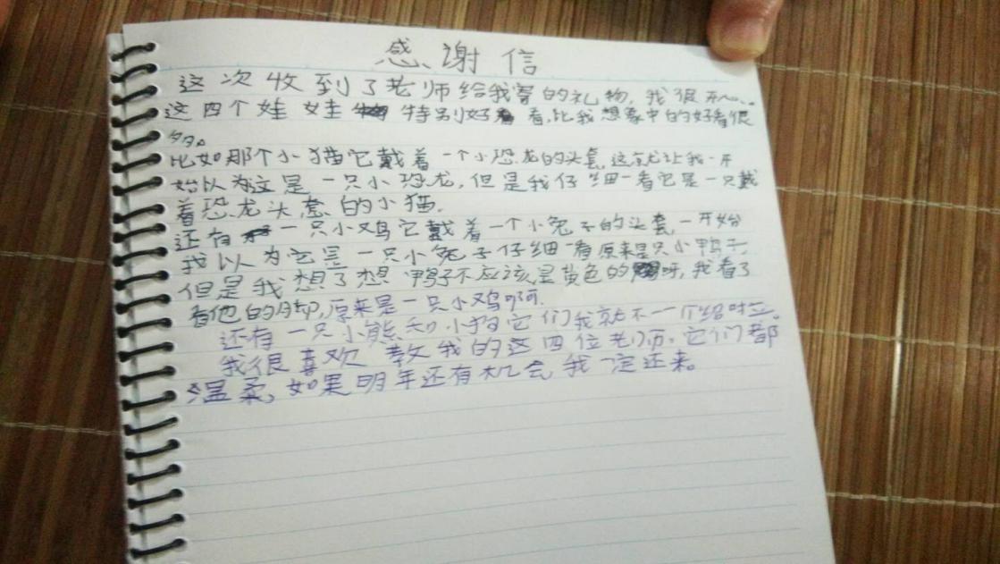 在幽静的夜晚,别的孩子睡觉时有父母温暖的怀抱,他们却只能抱着毛绒玩具。收到毛绒玩具的尹梓萱在感谢信中写道:“这次活动使我认识到了很多老师,感谢老师们教我们知识,还帮助我们实现愿望。”毛绒娃娃这些简单普通的东西,却是尹梓萱和几个孩子内心渴望已久的宝贝。“娃娃们都特别好看,小猫戴着一个小恐龙的头套,还有可爱的小熊和小狗……”陈婕在感谢信中用稚嫩的语言向志愿者们开心地描绘着娃娃的外貌,收到娃娃的幸福感溢于言表。
