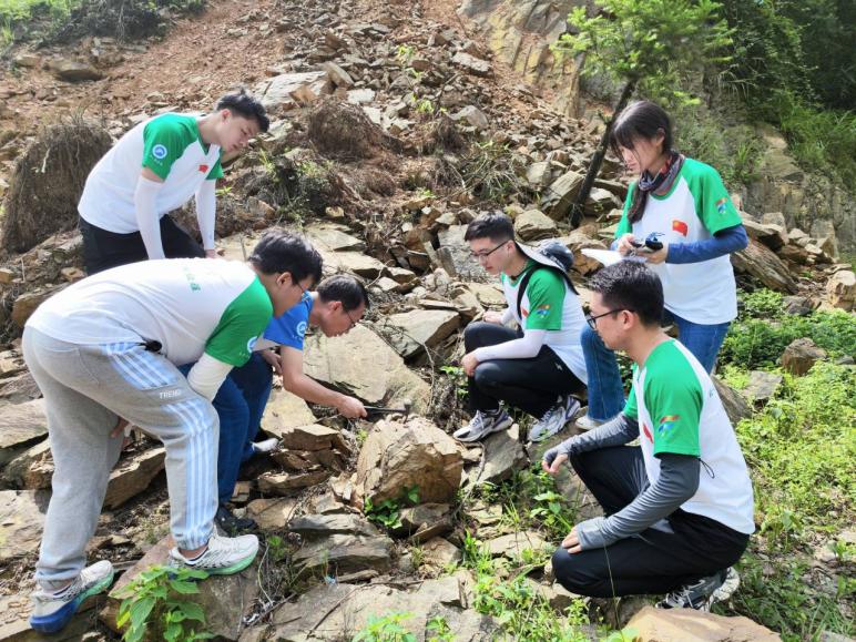 随后,实践团沿路行进,观测公路沿途及山区切坡地貌特征,并使用专业仪器地质锤、罗盘等工具对岩体类型、坡向、岩层走向等进行勘测,对海拔较高的山体滑坡用无人机拍摄观测,对切坡临空面、易滑岩组和软弱结构面进行全面观察,进而结合专业知识和经验对切坡灾害类型归纳,总结了当地岩石破坏特点以及滑坡灾害的主要原因。