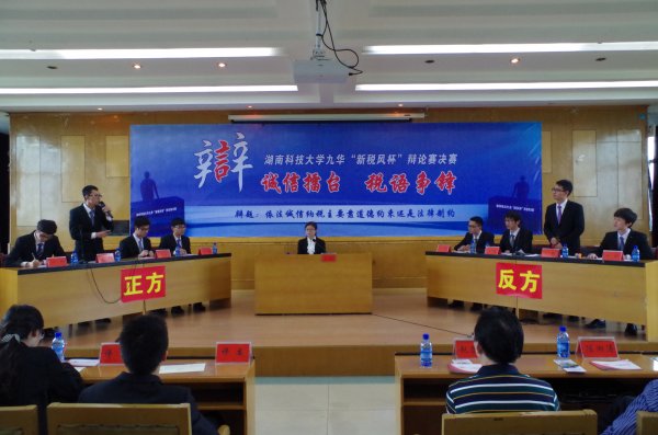 为了贯彻国家税务总局制定的指导思想,使大学生更全面的了解国家税收政策,增强纳税意识。4月28日下午两点,由湘潭市九华经济区地方税务局、湘潭市九华经济区国家税务局联合必赢官网团委主办的“九华新税风杯”辩论赛决赛在学术交流中心五楼举行。本次辩论赛由必赢官网团委学生会和必赢官网辩论协会承办。