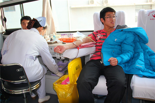 11点时,就有不少人在前来咨询处咨询,一颗爱心鼓舞着他们走上了献血车。填写表格,前期测试,准备工作渐渐完成,只等爱心人士挽起袖子将热血放出,由于很多人是第一次献血,不免紧张。当医生拿出血袋,看到比大号绣花针还要粗一倍的针头,比盒装牛奶盒还大的血袋,排在第一个的献血者表情变得凝重,可还是勇敢地坐上专用椅,挽起袖子伸出手。克服心理的恐惧很难,却愿意迎难而上,这才是真正的勇者。在医务工作者娴熟的操作后,有鲜血从针管顺利就出。抽血时长约5分钟,在这过程中,党支部工作人员为献血志愿者们送上一杯温水以及几句关心的问候,让爱心也温暖着每一位献血志愿者,一股股青春热血,一颗颗爱心满怀,使得每个献血者心中只有献血的光荣。看着称血秤变成400ml,医生拔出针头,他心中的石头也终于落地,送给我们一个发自内心的笑容。 “满血复活”后,他告诉我们:“这是我第一次献血,一开始很紧张,现在不会了,相信以后献血也不会紧张了,在抽最后100ml,心脏有点不适应,可能是缺氧,我觉得还是身体不够棒,以后要多加锻炼,有了好身体,明年再来。”后面的献血者在他的影响下,都积极参与到其中,献血工作进行得十分顺利。
