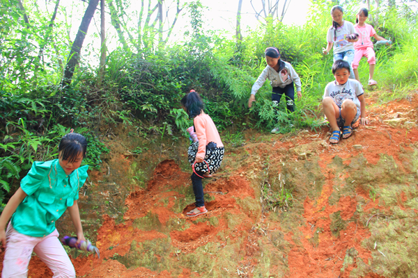 首先,由孩子们带路去曾经的小学,经过一段路程后,就看见了学校的围墙。墙体外壳破损,白漆块掉落在地上,和泥巴混在一起,校门上的大锁锈迹斑斑,足以见其年代久远。娟娟小朋友说:“我上高三的姐姐就是在这里上小学的。”学校位于半山腰,出校门就是一个斜坡,孩子们为了节省时间也经常走山间小路,安全性更是大大降低,这样的地区很容易发生山体滑坡,泥石流等自然灾害。期间志愿者为孩子介绍了一下本地的地质状况。