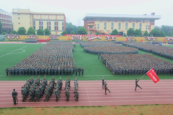 大会的第一项是阅兵式,在激昂的乐曲声中,校长李伯超步入会场检阅军训队伍。“同学们好!”“校长好!”“同学们辛苦了!”“为科大争光!”受检阅的队伍队列整齐、士气高昂、口号嘹亮。接下来,分列式正式开始,各个方队依次通过主席台,接受学院领导和部队首长的检阅。此次阅兵共有19个学院20个方队接受检阅。整齐的步伐,昂扬的斗志,都体现着科大人的风采。随后是大会中最具特色的一项,伴随着倒计时,8300多名新生用枕头在操场上摆出10到1的数字和字母“HNUST”。他们井然有序的蹲下起立,最终定格在湖科校训“唯实惟新,至诚致志”字样、校徽以及数字“16”的画面。这一独具匠心的表演,体现了科大人的创新精神