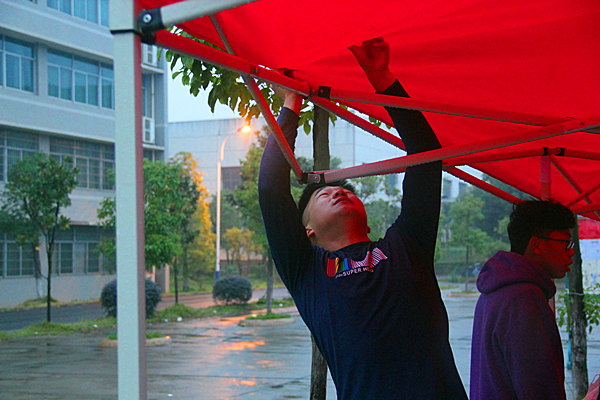 在早训之前,他们便将帐篷、桌子、药品、桶装水以及学生干部签到表从土木楼搬到军训场地并且将帐篷搭建好以及将所有物品摆放好。由于今天下了小雨,他们接到通知说早训取消。主席团成员在空隙时间吃了一点早餐后,便又回到服务台,通知各排上午军训取消并要求各排在附近找间教室自习。九点半,主席团带领着学生干部去新生自习教室了解新生情况并清点了人数。