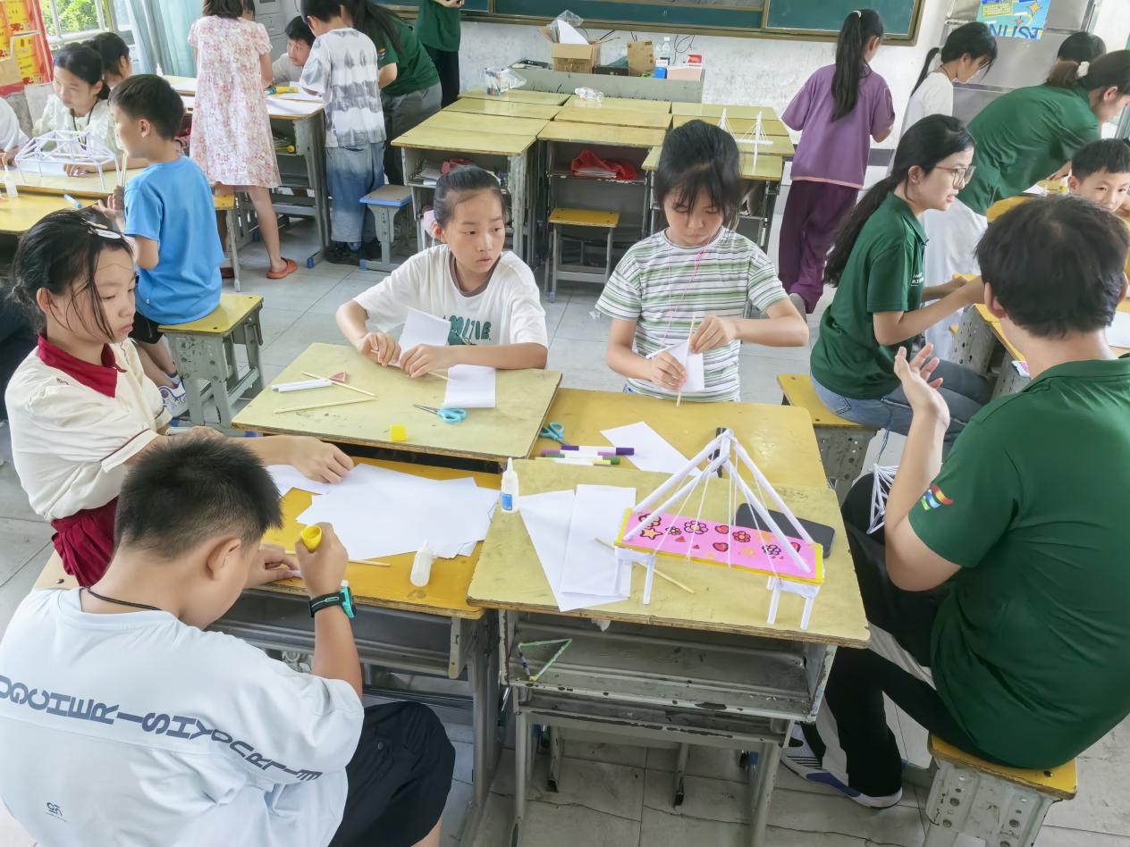 社会实践团的筑梦支教组在潘桥中学创新开设土木工程特色课程,通过结构建模、纸桥制作等趣味实践课程,将抽象工程知识转化为生动实践,在学生们心中播撒下工程的种子。还开展“请查收一封你的成长邀请函”素质课堂、防溺水、推广普通话等主题科普讲座,用专业和温度助力乡村教育发展。
