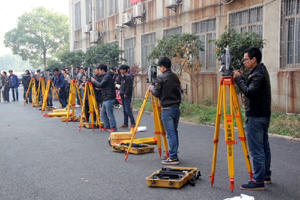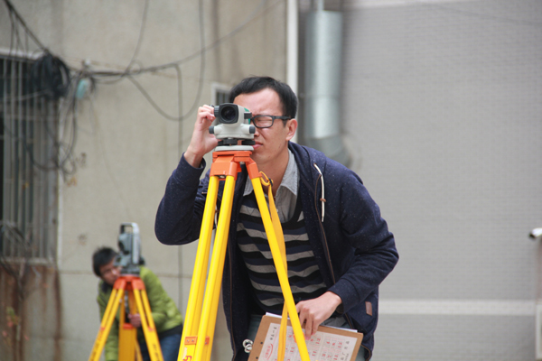 此次比赛分为水准仪与全站仪两个测量项目,学生通过抽签决定自己的比赛项目,考核时间为15分钟,由老师记录时间。全场统一采取吹哨的命令,先完成项目先呈交成果,以速度的快慢与准确度的高低作为评价标准。水准仪的考核要求学生通过辅助仪器准确测量前后高度差,而全站仪则要求学生通过数据采集、找准位点、调整镜头来准确测量坐标。每位同学分秒必夺,在保证测量无误的前提下力求用时最短,争取在比赛中取得好成绩。为了节省时间,有些参赛选手直接喊出自己的的测量结果。