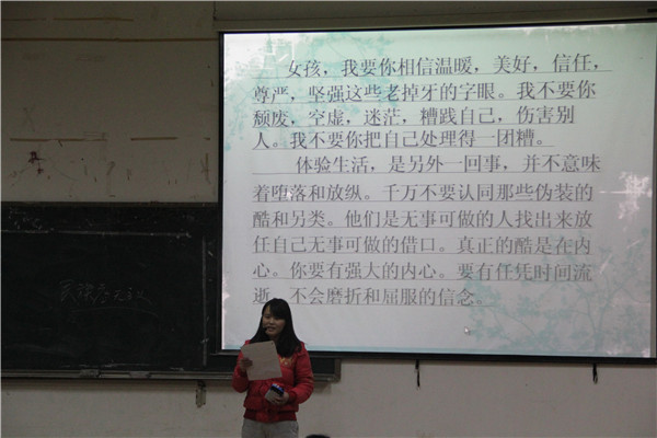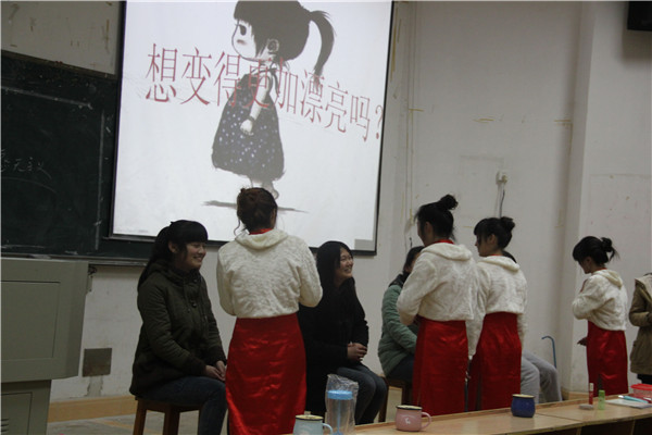 晚会由幽默诙谐的话剧《爱疯4》拉开帷幕,表演者精彩的表演,赢得了在场观众一阵阵热烈的掌声。接着,就表演者提出的“如果你是曾小贤,你是喜欢胡一菲还是喜欢诺澜”的问题,主持人在现场进行了采访,观众们各抒己见,争先回答。采访过后,参加晚会的学生会代表们向在场的女生们送去节日的祝福,并预祝此次晚会圆满成功。晚会的第二个节目是由彭薇薇同学献给大家的朗读《亲爱的女孩》,她侃侃而谈,教女生如何去爱,如何去活出自己的精彩。在两个精彩的节目之后,迎来了第一轮的游戏时间,巧合的是,现场有一位同学也在过生日,在场观众同唱“生日快乐”歌,祝福她生日快乐。晚会最后,院礼仪队的同学现场示范,教女生们画生活妆。