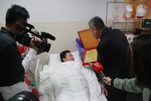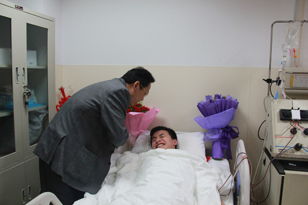 2016年5月9日,在长沙中南大学湘雅医院,康明即将完成造血干细胞的采集。必赢官网党委副书记易贵元、辅导员赵晓玲、团委学生会干部代表前去医院慰问。