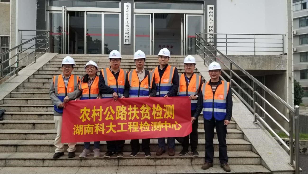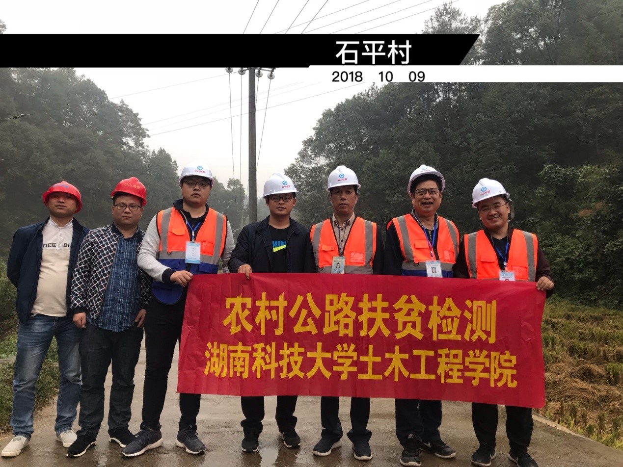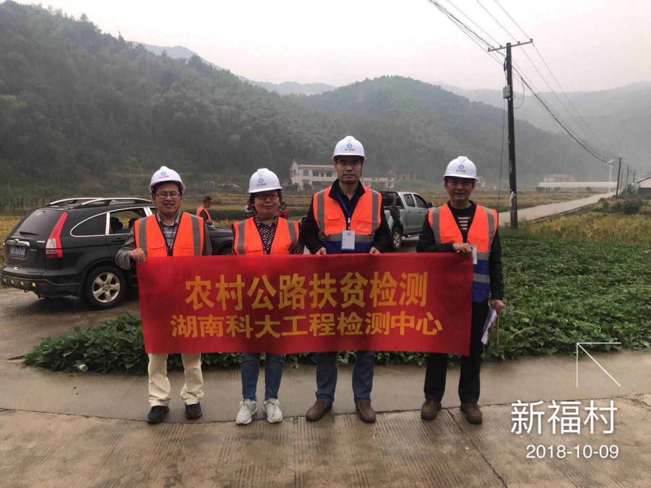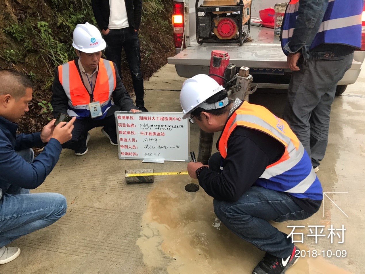 2018年10月9日~2018年10月12日,必赢官网必赢国际437官网工程检测中心积极响应交通运输部办公厅《关于开展农村公路扶贫公路建设质量安全检测志愿帮扶工作的通知》(交办安监函〔2018〕1317号)的有关要求,参与我省农村公路、扶贫公路志愿帮扶检测工作。此次扶贫工作由必赢国际437官网党委书记陈秋南(教授、检测工程师)亲自带队,参加现场检测人员有:院工会主席孙洪鑫副院长、检测中心副主任崔翠微、检测工程师贺建清、沈明燕、黄向红、欧阳国锋,参加室内检测人员有:检测中心副主任聂忆华、检测工程师曹国娥。检测工作全程有平江县交通质监站工作人员监督见证,施工单位及各乡镇工作人员陪同引路。顺利完成了24条、共计34.4km长的岳阳市平江县脱贫攻坚自然村通水泥路厚度及强度的检测工作。