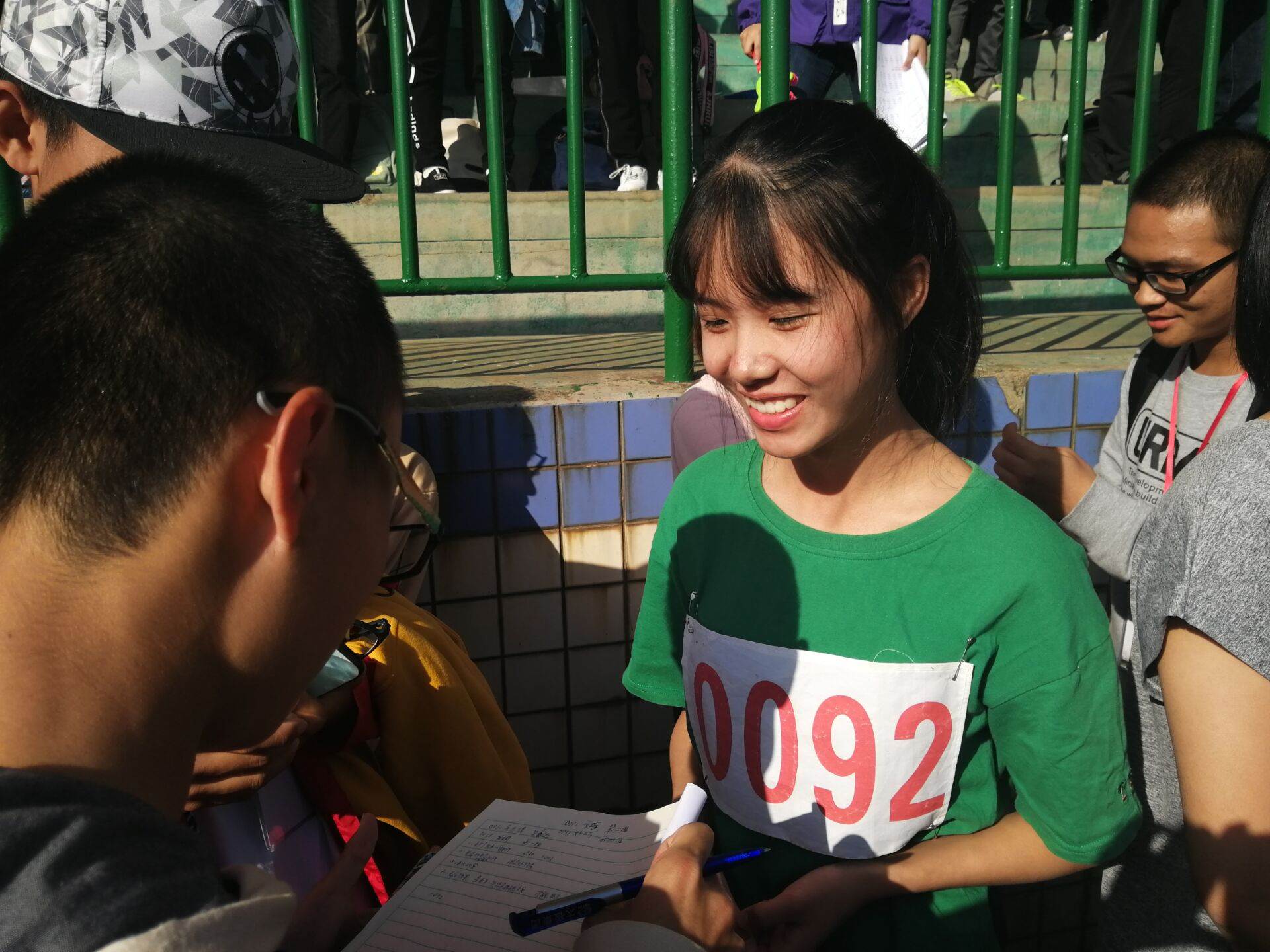 比赛开始前,选手们都紧张有序地做着准备活动。随着裁判员的一声枪响,大家都不疾不徐迈着稳定的步伐向前。每当运动健儿们经过观众席时,所有人都摇动起手中的彩旗和加油棒,为运动员们加油助威。选手们听到如雷的掌声和呐喊,都更加奋力地向前冲去。到了第二圈,选手们不断调整着自己的呼吸和节奏,为最后的冲刺做准备。快到终点时,选手们都已精疲力竭,汗流浃背,但仍拼尽全力冲向终点。快了,快到了!在一声高过一声的加油呐喊中,所有选手依次冲过终点。不断地超越自我,征服自我才是真正体现自我。正如李瑶同学在采访中表示的那样,无论结果如何,都会挑战自我,在运动会上再展英姿。