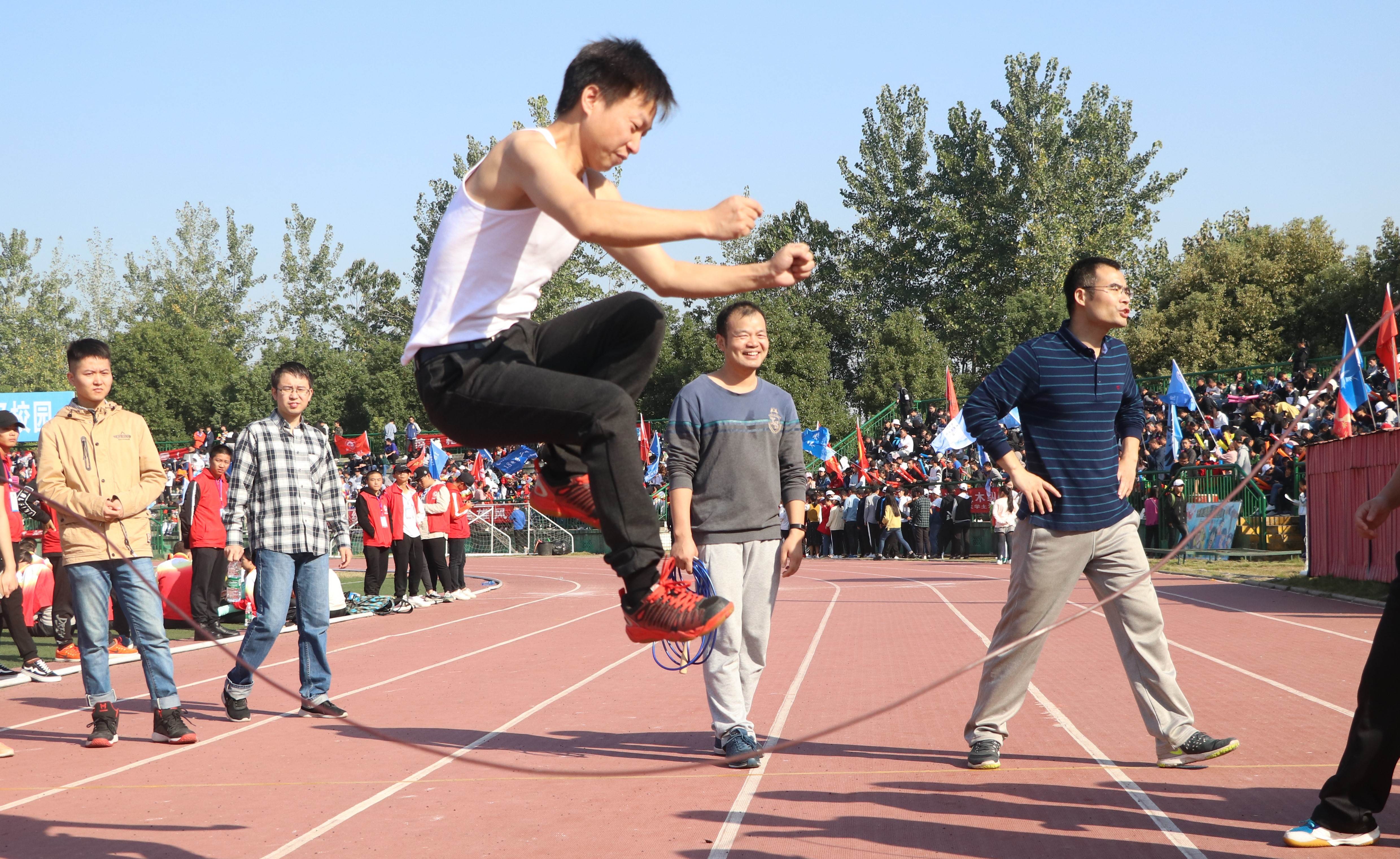 比赛前,教职工们早已迫不及待的拉开长绳开始他们有序的热身训练。老师们排着队等待自己跳的那一刻,第一个跳完紧接着就是第二个,依次这样下去,绳子竟从未断过。有的老师虽然年长,他们的精神风貌和反应速度却丝毫不逊色于其他的年轻老师。运动使他们意气风发,全心全意地投入到了这个运动中。轮到土木学院上场时,训练过的老师们在一开始就找到了状态,脸上洋溢着喜悦的笑容,井然有序的从一边排队依次起跳。随着绳子的摆动,他们的也跟着节奏起跳,落地,再起跳。随着时间的流逝,老师们的额头上挂满了豆大的汗珠,但他们越战越勇。一场和谐有爱的跳绳比赛就在一片欢声笑语中结束了。