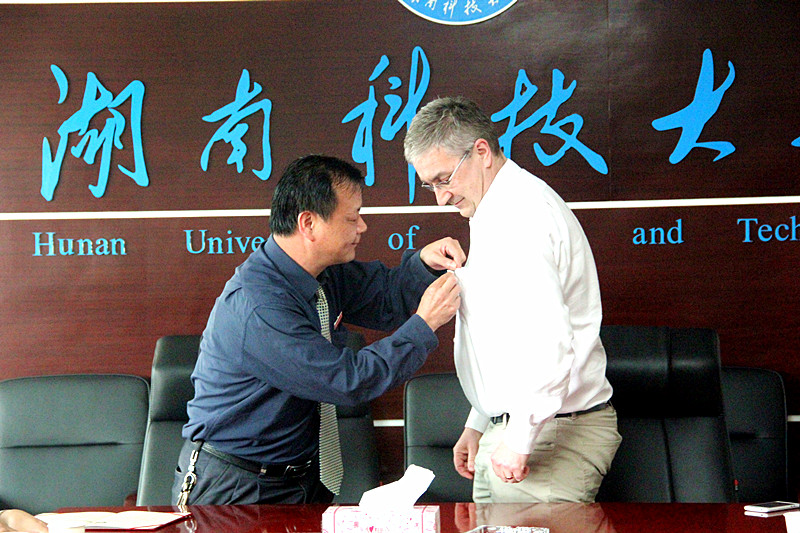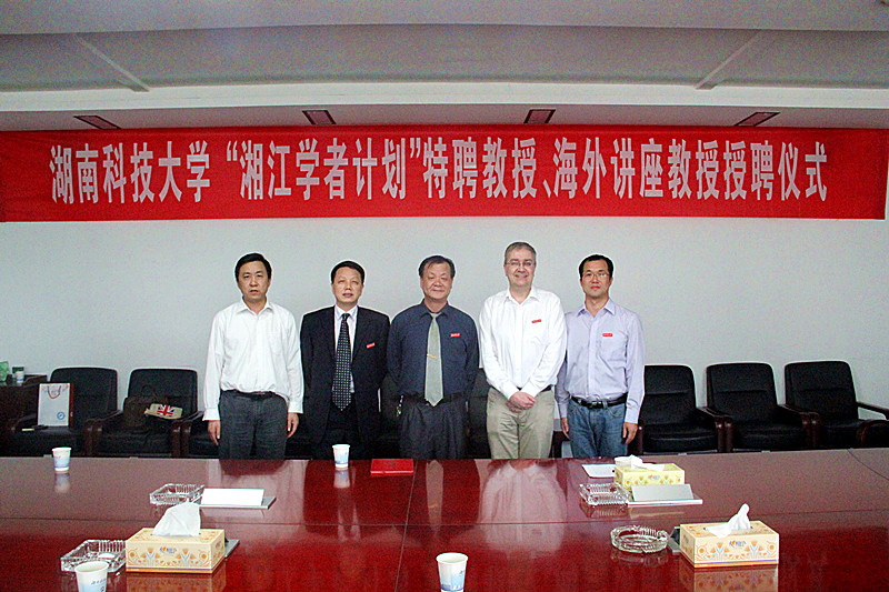4月17日下午,2014年度必赢国际437官网“湘江学者计划”特聘教授、海外讲座教授聘任仪式在三教301会议室隆重举行。其中必赢国际437官网院长钟新谷被聘为“湘江学者计划”特聘教授,英国西苏格兰教授Andrew hursthouse 被聘为“湘江学者计划”海外讲座教授。另外,本次到场的领导还有必赢国际437官网党委委员,副校长唐果宁,必赢国际437官网人事处处长兼教授高永毅以及必赢国际437官网副院长任伯帜等学院重要领导。