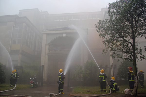 演练一开始,外语楼便冒起浓烟,接着消防车立即赶到,消防人员迅速地用消防枪对准冒烟处,目的是演示火灾情况下消防人员灭火的情形。同时,由工作人员演示了火灾发生时的正确逃生方法,特别强调了用湿毛巾捂住鼻子弯腰逃生。其次由工作人员向大家详细介绍了干粉灭火器的使用方法,并向大家做了示范。主要步骤有:一、先将灭火器上下颠倒几次,使瓶内干粉松动。二、扯开保险锁,拉掉保险销。三、在距火焰两米的地方,右手用力压下压把,左手拿着喷管左右摇摆,喷射干粉覆盖燃烧区,直至把火全部扑灭。为了让新生进一步了解干粉灭火器,工作人员现场找了二十多个新生亲自操作了灭火器。演练最后一项是高空绳索降落演示,由工作人员指导新生学习高空绳索降落的方法。